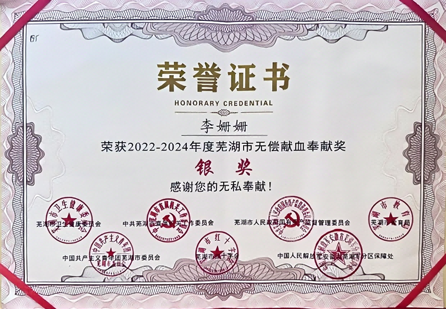 09-199月12日,从芜湖市无偿献血先进表扬活动中传来喜讯,我队财务科李姗姗同志因累计无偿献血量达到4800毫升,荣获“2022-2024年芜湖市无偿献血奉献奖银奖”。这一殊荣,不仅是对她个人无私奉献精神的高度肯定,也为我单位精神文明建设增添了一抹亮丽的色彩。