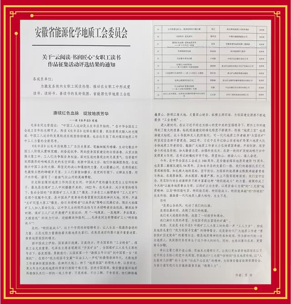 据悉,本次读书作品征集活动旨在丰富女职工精神文化生活,引领阅读风尚,鼓励广大女职工通过阅读与写作提升素养、为建设现代化安徽贡献更多巾帼力量。活动共收到全省能源化学地质系统报送的文稿类作品120件,二队苏雨同志的作品《赓续红色血脉 绽放地质芳华》——读《长辛店》有感,主题鲜明、情感真挚、文笔细腻,成功跻身获奖行列,展现了二队职工良好的文化素养和精神风貌。