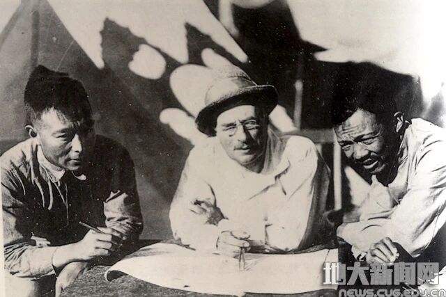 袁复礼(左)和瑞方团长斯文赫定(中)、中方团长徐炳昶(右)在一起研究工作(1927年)