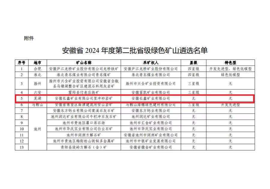 日前,安徽省自然资源厅发布2024年度第二批省级绿色矿山遴选名单公告,由二队提供省级绿色矿山建设技术服务的安徽长鑫矿业有限公司里冲砂岩矿成功入选。
